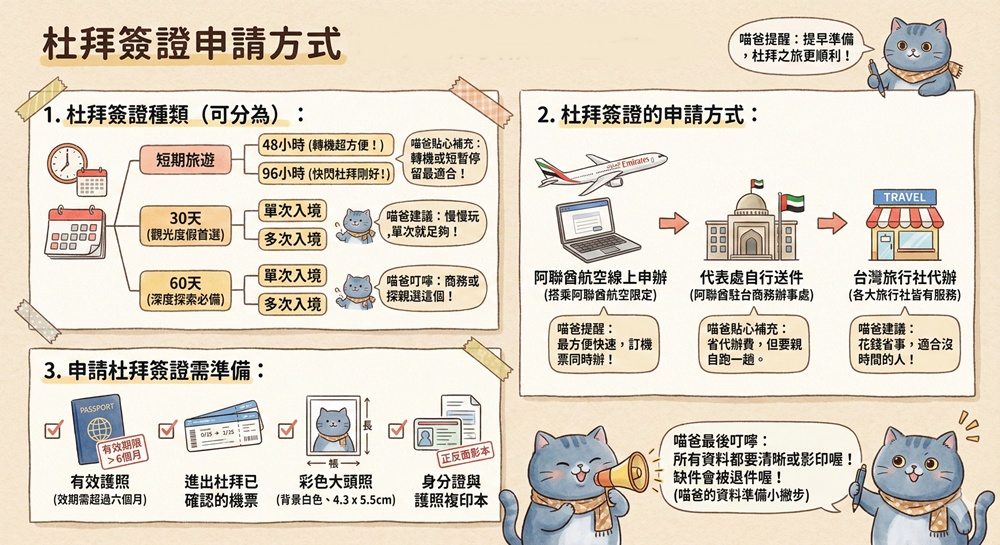 杜拜簽證種類可分為:短期旅遊(48小時、96小時)、30天(單次、多次)、90天(單次、多次)