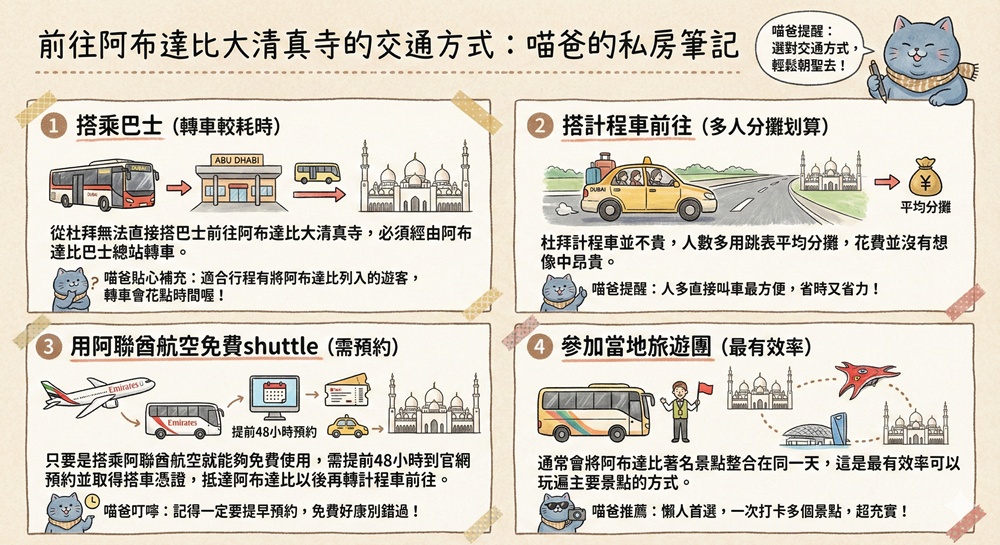 從杜拜到阿布達比有四種方式,分別為:搭乘巴士、包計程車、阿聯酋免費shuttle與參加當地旅遊團
