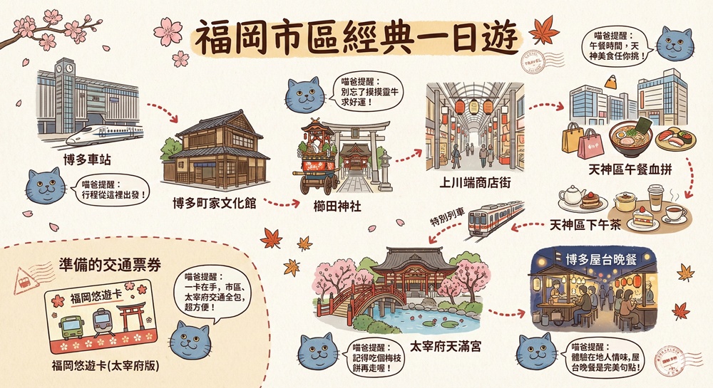 從博多車站出發的福岡一日遊,喵爸規劃的路線是:博多車站>>博多町家文化館>>櫛田神社>>上川端商店街>>天神區午餐血拼>>天神區下午茶>>太宰府天滿宮>>博多屋台晚餐。準備的交通票券是福岡悠遊卡(太宰府版)