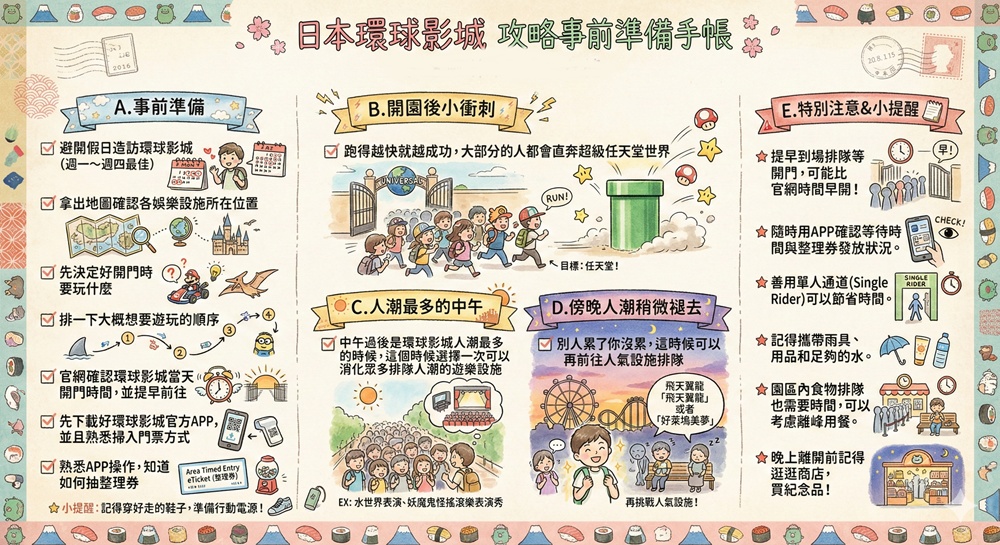 如果沒有買快速通關,提早到達現場就很重要,這是決定一整天是否順利的關鍵(以08:30開園為例)