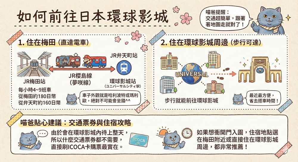 由於會在環球影城內待上整天,所以什麼交通票券都不需要,直接刷ICOCA卡購票最實在。如果想衝開門入園,住宿地點選在梅田附近或直接住在環球影城周邊,都非常推薦!