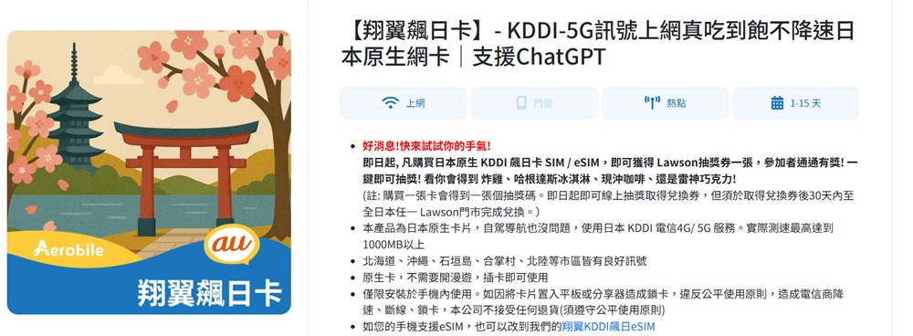 | 實體卡(翔翼電訊) KDDI原生卡 | 吃到飽 | 天數:2~31天任選 價格:279~2599元 | KDDI原生卡 速度飛快延遲低 輸入kimiyo 95折 |