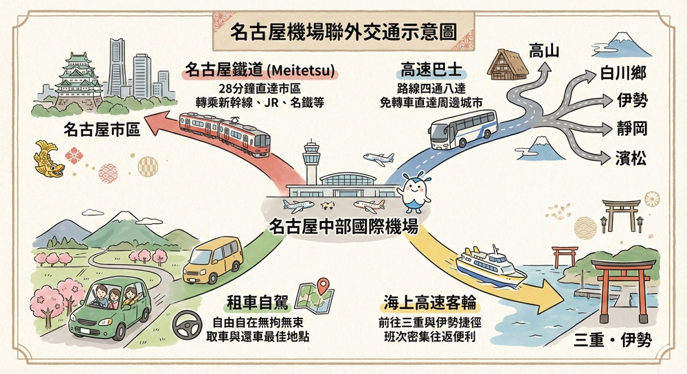 搭乘名古屋鐵道28分鐘就可以直達名古屋市中心、路線四通八達的高速巴士接駁鄰近景點、高速渡輪直達三重縣、自由度最高的租車自駕,位置優異的名古屋中部機場,對於接駁交通有最完善的規劃。