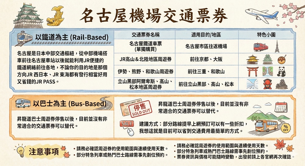 名古屋機場交通、JR PASS選擇、交通儲值卡、高速巴士、日本自駕懶人包、冬季開車、ETC PASS、Tabirai租車、ToCoo租車、日本上網整理