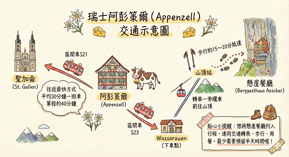 交通方式:從阿彭策爾(Appenzell)火車站搭乘區間車S23於Wasserauen下車,再轉乘一旁纜車前往山頂,到達山頂以後再步行約15~20分才能抵達Berggasthaus Aescher。連同交通轉乘、步行、用餐,想將懸崖餐廳列入行程最少需要預留半天時間。