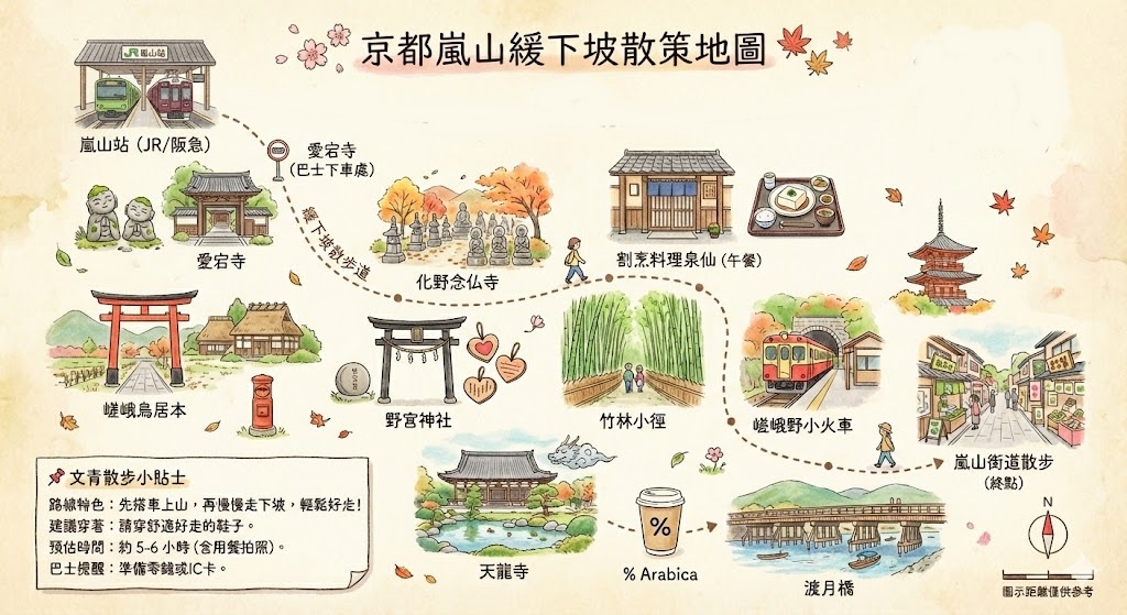 路線:愛宕寺>>嵯峨鳥居本>>化野念仏寺>>割烹料理泉仙>>野宮神社>>竹林小徑>>嵯峨野小火車>>天龍寺>>% Arabica>>渡月橋>>嵐山大街