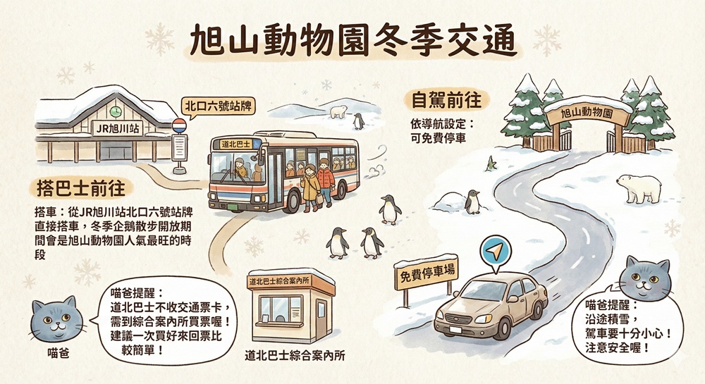 自駕前往則是導航設定:旭川市旭山動物園,可免費停車但沿途積雪駕車要十分小心