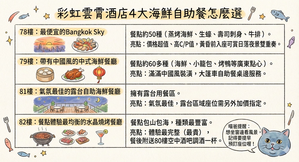 買一張約台幣1000多塊的彩虹雲霄酒店餐券,螃蟹、生蠔、牛排、淡菜隨便你吃,還附送80樓高空酒吧調酒與頂樓露台免費入場券,這麼高CP值的曼谷澎派海鮮自助餐,沒排入行程實在不行!