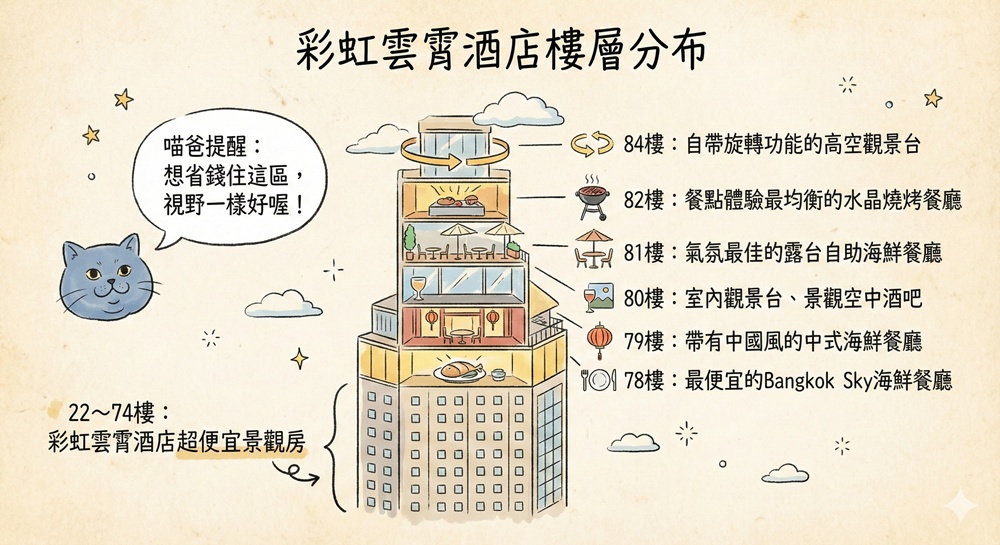 彩虹雲霄酒店共有660間房的驚人規模,區分為標準(22~45樓)、天空(46~63樓)、雲霄(64~74樓)三個部分,儘管已經不再是曼谷最高摩天大樓,但仍保有最高飯店的名號。