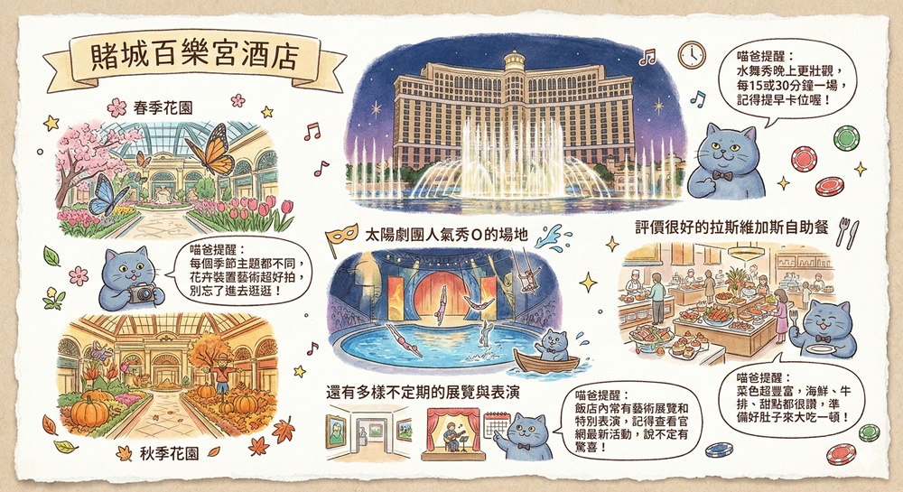 百樂宮酒店位於拉斯維加斯大道最精華地點,全年可說是精彩展演不斷,喵爸覺得除了入住一晚還有五件事絕對稱得上錯過可惜^^