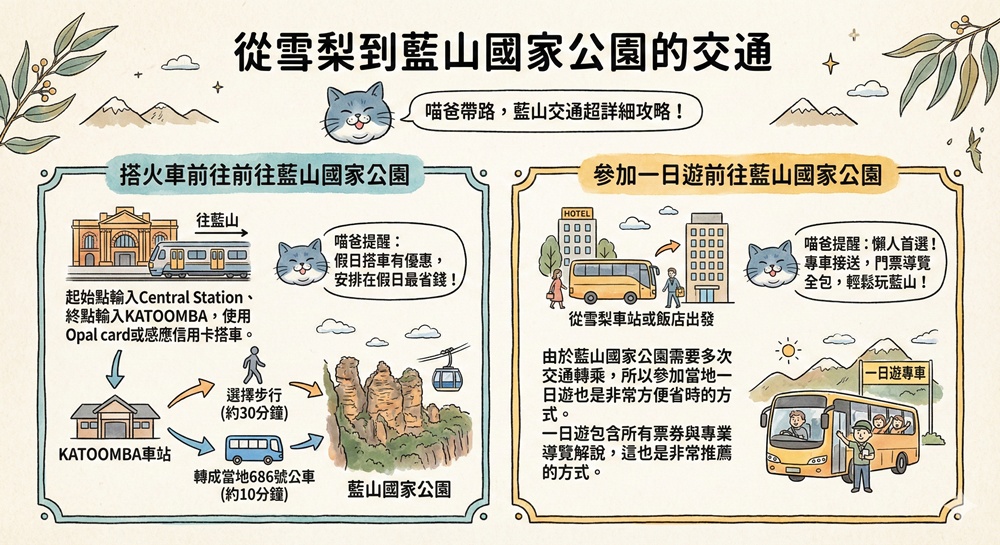 由於藍山國家公園需要多次交通轉乘,所以如果旅行時間不長參加當地一日遊也是非常方便省時的方式。一日遊會從雪梨車站或飯店出發,包含所有票券與專業導覽解說,這也是非常推薦的方式。