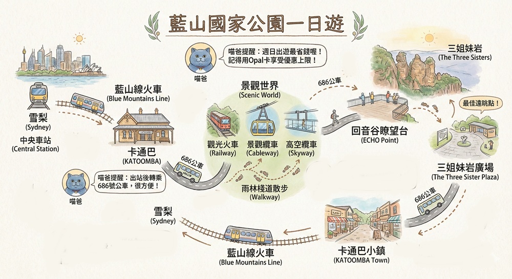 喵爸的路線:雪梨>>KATOOMBA>>Scenic World(搭乘三種纜車散步藍山)>>ECHO Point 遠眺三姐妹岩>>The three sister Plaze>>卡通巴(KATOOMBA)>>雪梨