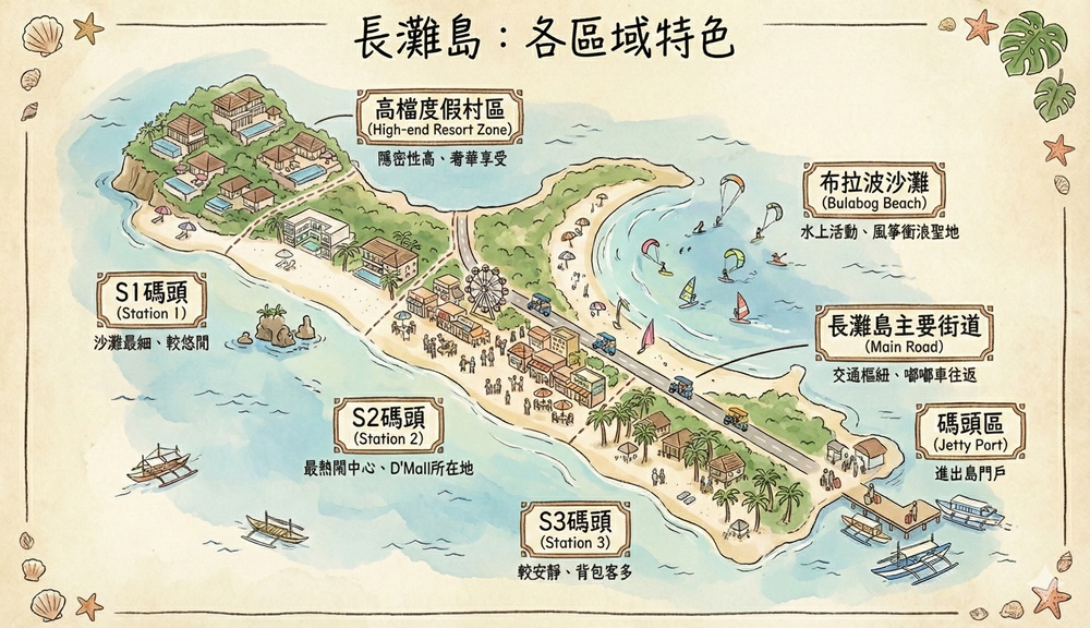 長灘島大概可以分為下圖幾個區域:高檔度假村、長灘島白色沙灘(S1碼頭、S2碼頭、S3碼頭)、碼頭區、布拉波沙灘(Bulabog Beach)與長灘島主要街道。