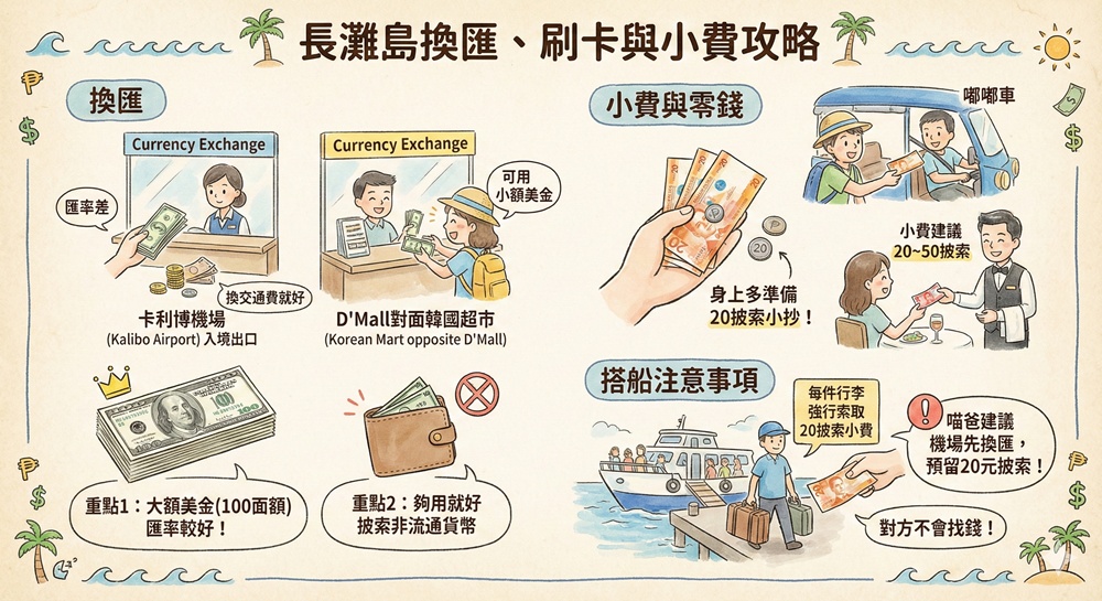 儘管台灣也能兌換披索,但是攜帶美金到長灘島兌換仍然是匯率最好的方式。披索以面額100披索以下最好用,並且身上一定要多準備20披索小抄,在搭乘嘟嘟車、給小費時都很好用。