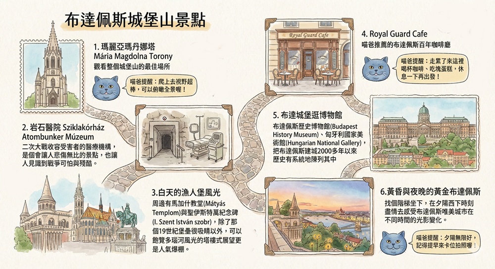 景點包含:瑪麗亞瑪丹娜塔(Mária Magdolna Torony)、岩石醫院(Sziklakórház Atombunker Múzeum)、漁人堡(Halászbástya)、布達城堡、布達佩斯歷史博物館(Budapest History Museum)、匈牙利國家美術館(Hungarian National Gallery)