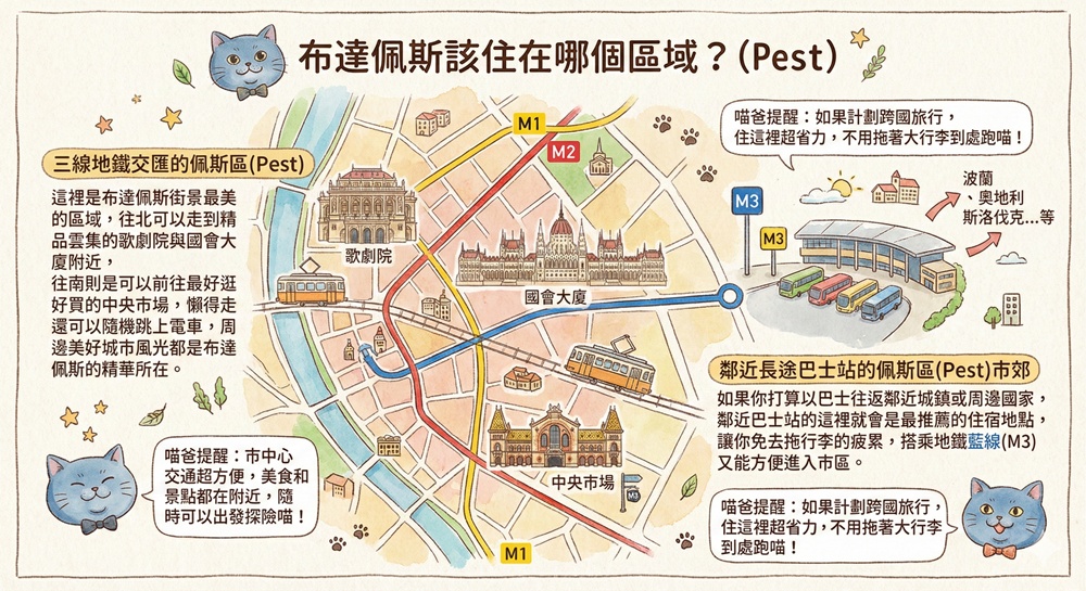 三線地鐵交匯的佩斯區市中心、鄰近巴士站的便捷市郊,這兩個就是布達佩斯最推薦的住宿地點。喵爸也在延伸閱讀文章之中列出這次在布達佩斯住宿的三家飯店,每一家都很推薦。