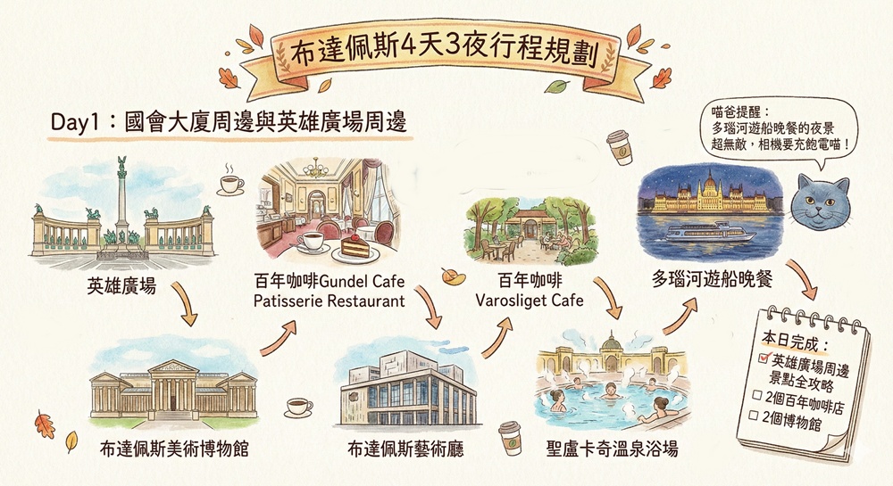 本日完成:英雄廣場周邊景點全攻略、2個百年咖啡店、2個博物館