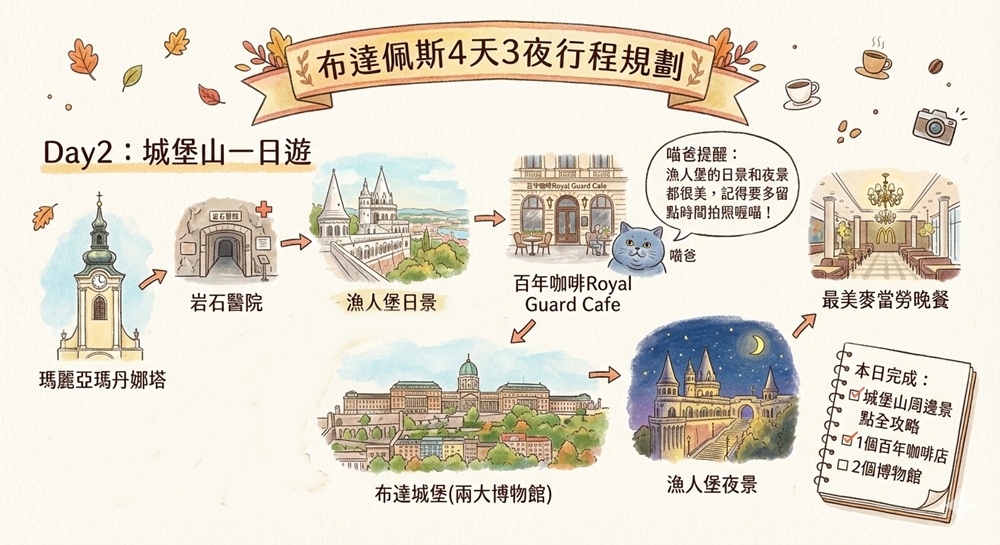 行程:城堡山一日遊(瑪麗亞瑪丹娜塔>岩石醫院>漁人堡日景>百年咖啡Royal Guard Cafe>布達城堡(兩大博物館)>漁人堡夜景)>最美麥當勞晚餐