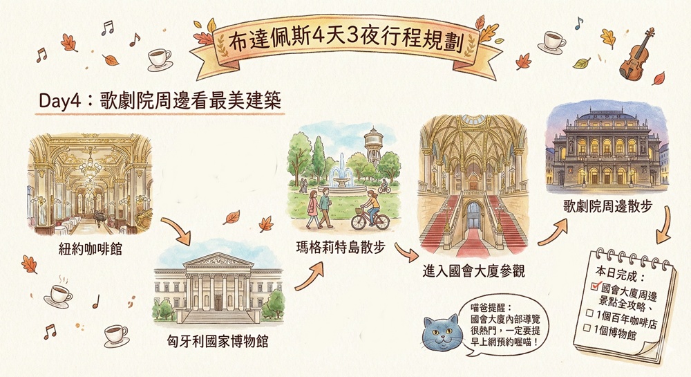 行程:紐約咖啡館>匈牙利國家博物館>瑪格莉特島散步>進入國會大廈參觀>歌劇院周邊散步