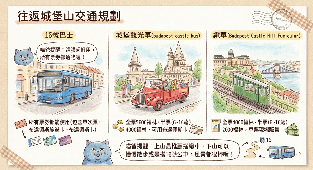 城堡山除了是布達佩斯最著名的漁人堡、布達城堡所在位置,這裡也是觀看國會大廈最厲害的制高點。城堡山私人車輛一律止步,想登上城堡山不外乎就是16號巴士、城堡觀光電瓶車(budapest castle bus)與纜車(Budapest Castle Hill Funicular)。