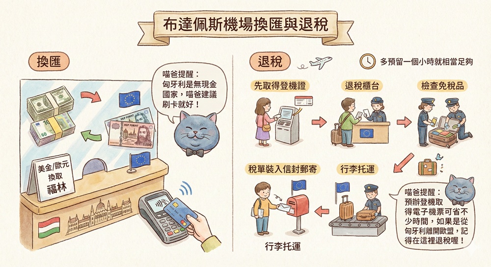 換匯:機場就可以用美金或歐元換取匈牙利福林,由於匈牙利幾乎是無現金國家,喵爸建議不用換太多(甚至可以完全不用換),全部以刷卡結帳就好。