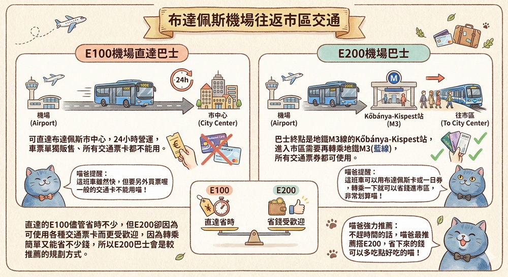 從布達佩斯機場往返市區仰賴E100、E200兩條路線巴士,直接從售票機購票會是最簡單的方式(可刷卡)