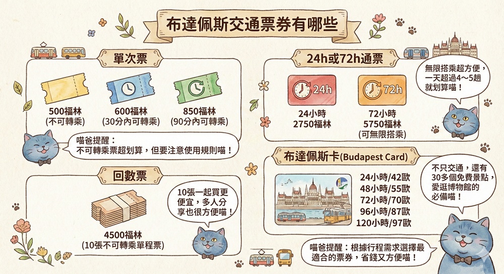24h或72h通票:24小時2750福林、72小時5750福林,時間內可無限搭乘(一天只要超過4~5趟就划算)