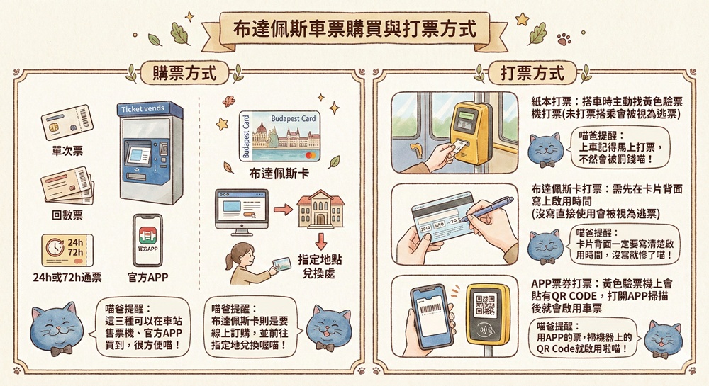單次票、回數票、24h或72h通票,這三種可以在車站的售票機買到(可刷卡),也可以下載BudapestGO從APP上面購買;布達佩斯卡則是需要線上訂購並前往指定地點兌換