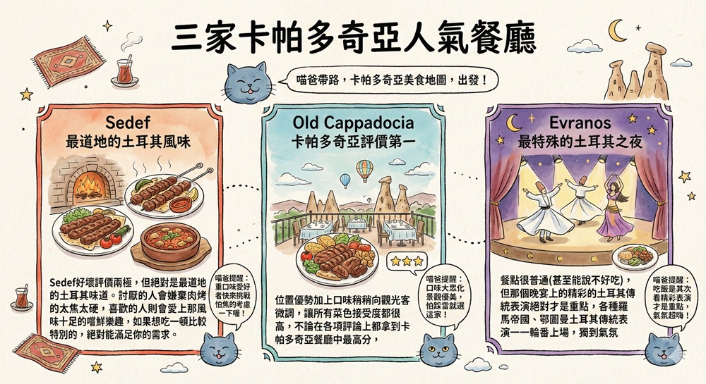 主打最道地味道的Sedef、網路評價最好的Old Cappadocia、搭配土耳其之夜表演的Evranos,卡帕多奇亞三家截然不同風格的餐廳,這就是來到卡帕多奇亞最推薦的三個選擇。其中搭配土耳其之夜的Evranos更是旅行團與遊客的最愛,也被列為來到卡帕多奇亞一定要排入行程中的餐廳!