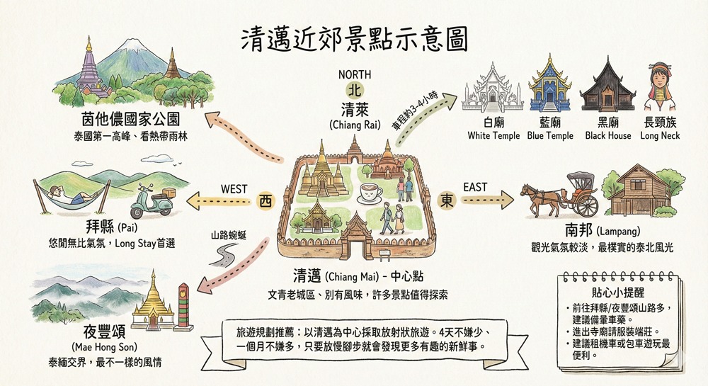 以清邁為中心點、採取放射狀規劃是清邁旅遊非常推薦的方式,從清邁出發往北前往清萊、往東前往南邦、往西前往茵他儂國家公園、拜縣與夜豐頌,都能夠規劃相當順暢的行程;如果你不想跑遠,越來越文青的清邁老城區也有非常多景點值得去探索。