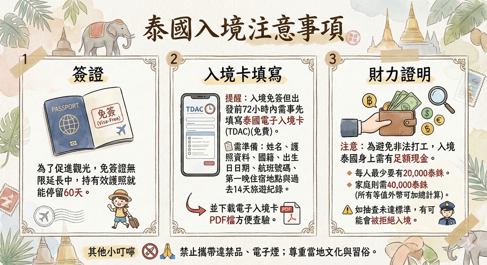 提醒:入境免簽但出發前72小時內需事先填寫泰國電子入境卡(TDAC)(免費),需準備姓名、護照資料、國籍、出生日期、航班號碼、第一晚住宿地點與過去14天旅遊紀錄,並下載電子入境卡PDF檔方便查驗