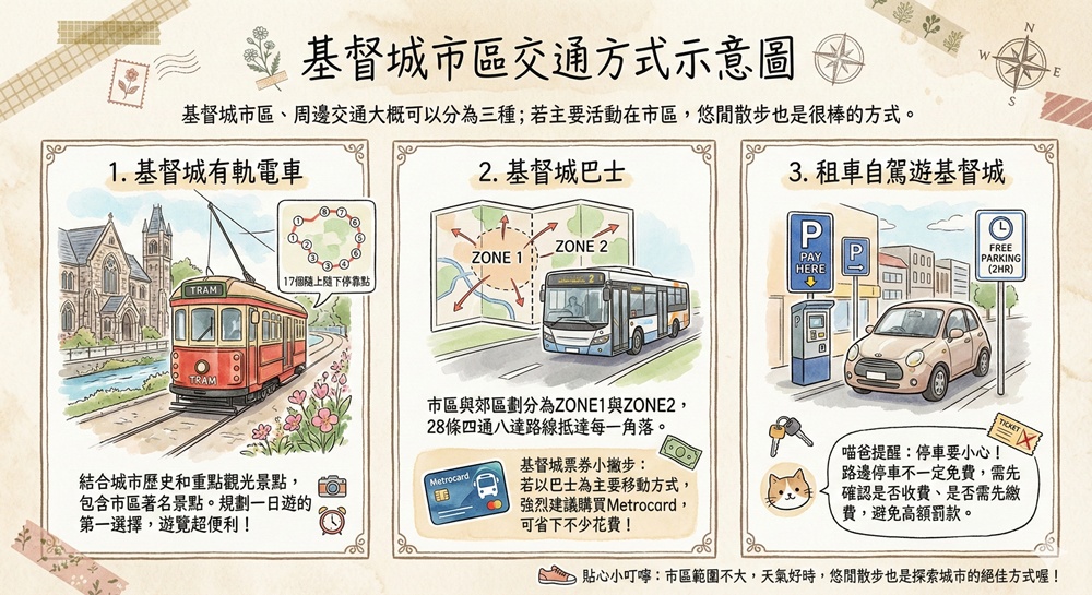 基督城市區、周邊交通大概可以分為基督城路面電車(Christchurch tram)、基督城巴士(Buses)與租車自駕3種,但是如果你主要活動範圍都在基督城市區,悠閒散步也是很棒的方式。