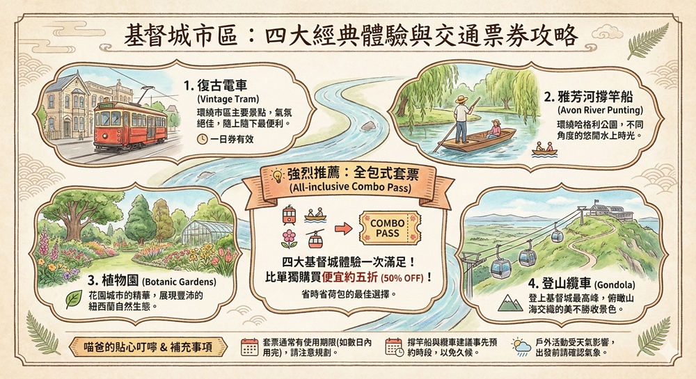 復古電車、植物園、雅芳河撐竿船與登山纜車,這四項可說是基督城最著名的活動,如果四大基督城體驗都想參加,全包式套票會比單獨購買便宜的多(大約會是五折)