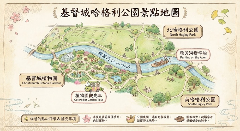 面積廣達16公頃的哈格利公園以廣大遼闊綠地聞名,饒富詩意的雅芳河貫穿其中將更將哈格利公園劃分為南、北公園與基督城植物園(Christchurch Botanic Gardens)三個部分。