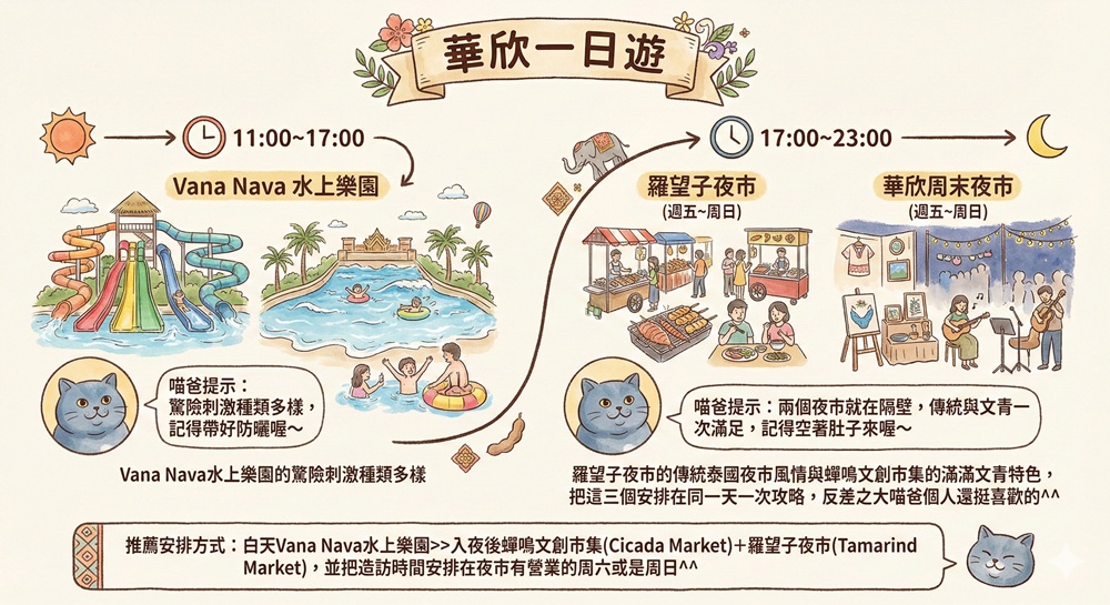 Vana Nava水上樂園的驚險刺激種類多樣,羅望子夜市的傳統泰國夜市風情與蟬鳴文創市集的滿滿文青特色,把這三個安排在同一天一次攻略,反差之大喵爸個人還挺喜歡的^^