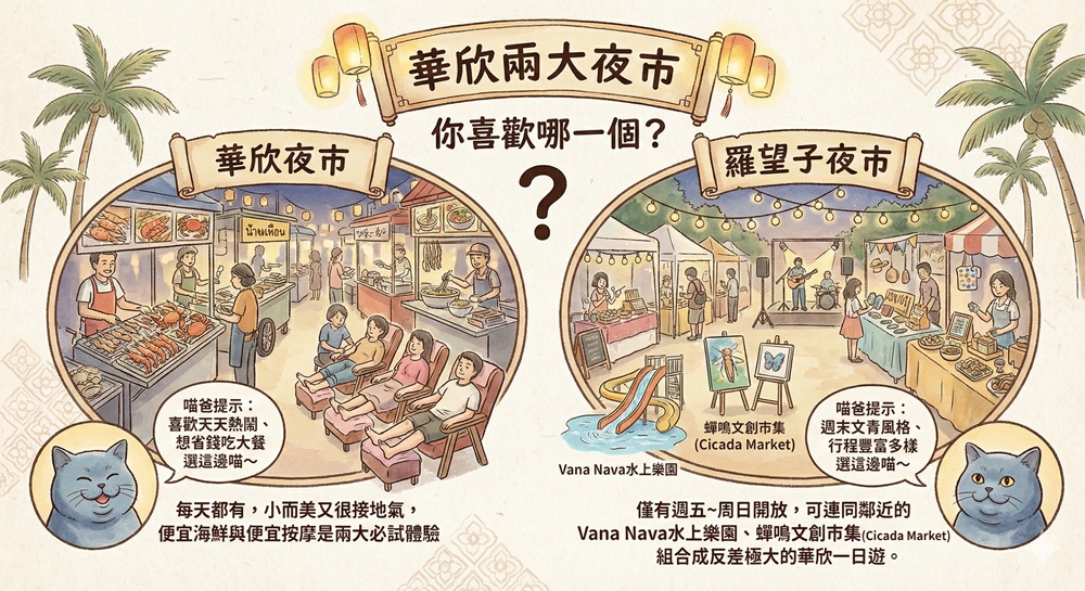 華欣最有名的兩個夜市就是位於鬧區的華欣夜市(HuaHin night Market)與郊區的羅望子夜市(Tamarind Market),而營運不久的蟬鳴文創市集(Cicada Market)就是想要用文創文青風去打開另一條不同的體驗。