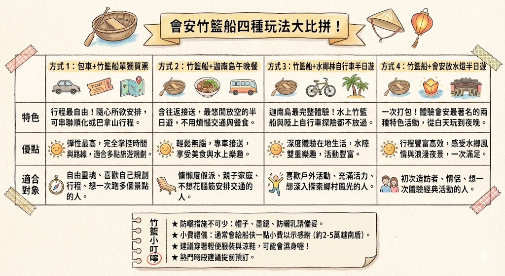 預定連結:竹籃船單獨買票、竹籃船+迦南島午晚餐、竹籃船+水椰林自行車、竹籃船+會安放水燈