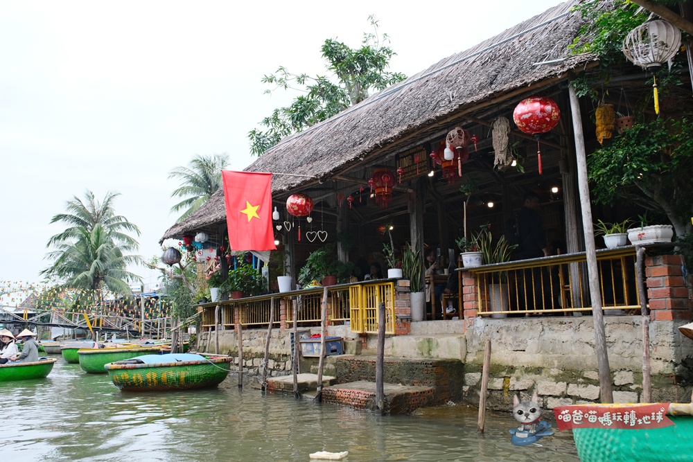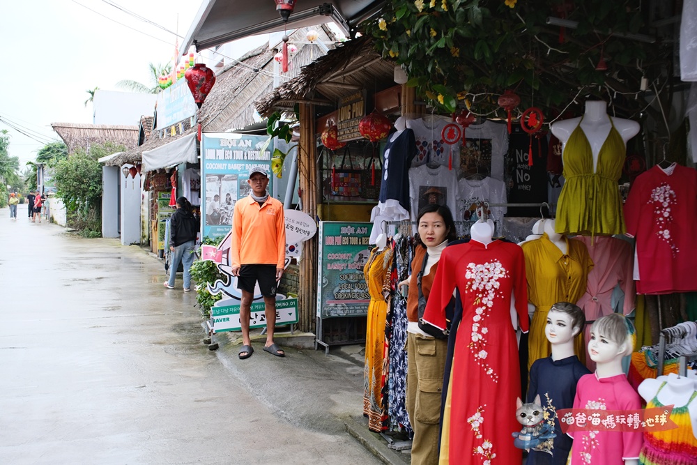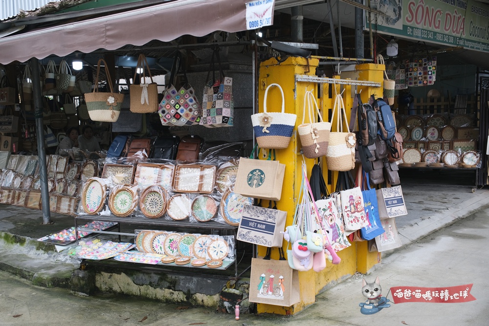 隨著觀光客近年湧入搭乘竹籃船,迦南島周邊也慢慢形成小型的市集聚落,司機放我們在大馬路邊下車以後,沿著小路慢慢走到河邊沿途都是滿滿的紀念品店,販售品項以竹編小物、傳統奧黛與仿冒名牌包包為主,品質有些參差不齊,所以也就沒有吸引到太多我們的目光。