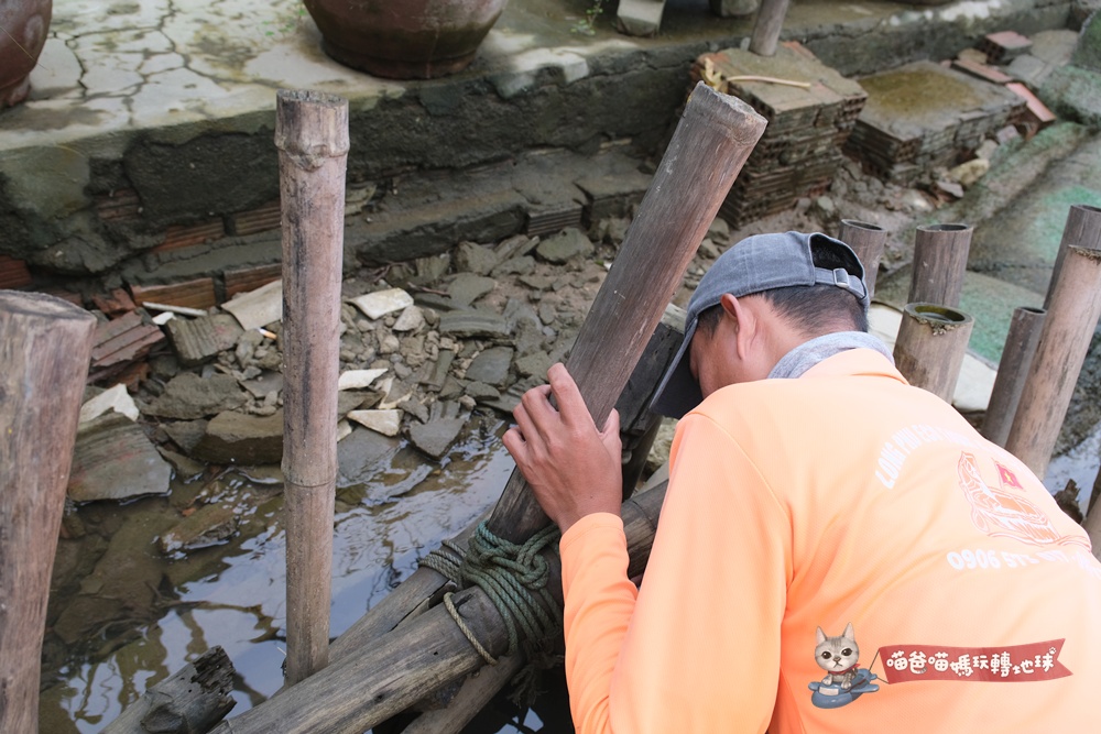 來到水道稍微較寬廣的區域,這裡就是由竹籃船高手所鎮守,很會自High的他就以高超的技術划著竹籃船原地打轉,並且會邀請遊客一起登上他的竹籃船體驗天翻地覆的高速旋轉