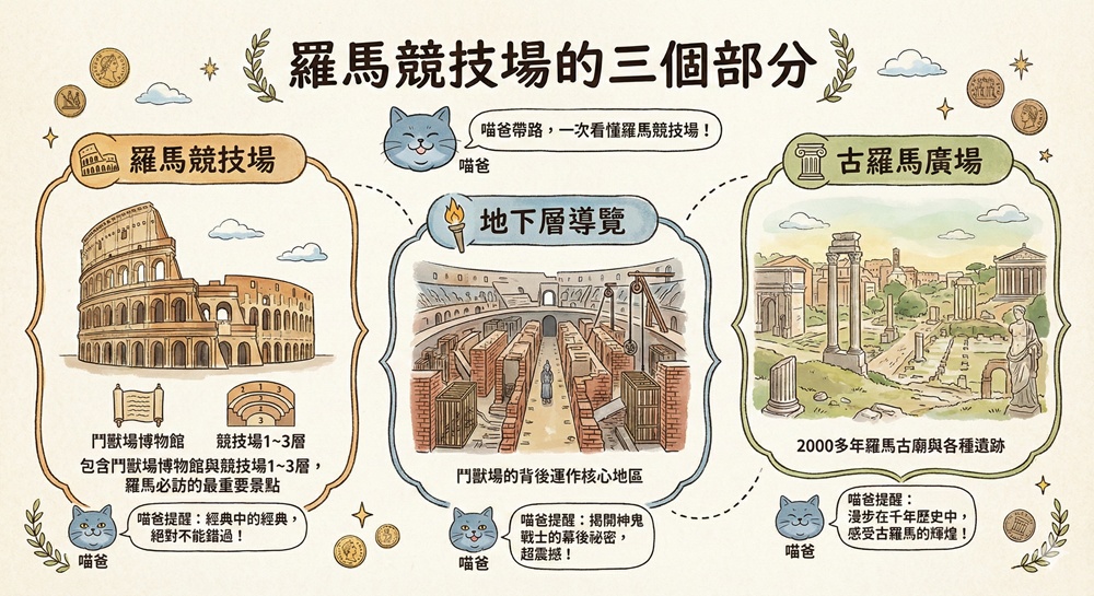 羅馬競技場:包含鬥獸場博物館與競技場1~3層,羅馬必訪的最重要景點