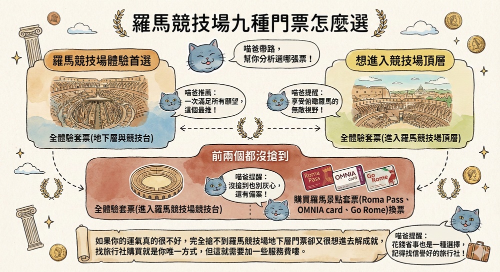 前兩個都沒搶到:全體驗套票(進入羅馬競技場競技台),或購買羅馬景點套票(Roma Pass、OMNIA card、Go Rome)換票