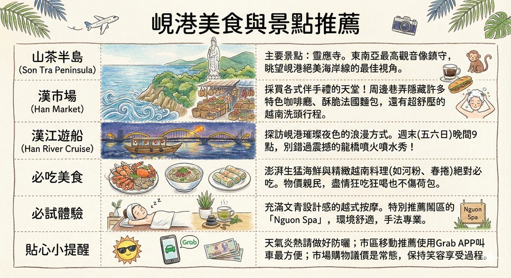 峴港市區景點相對單純簡單,交通則以全程包車或是搭乘Grab為主,隱藏在其中的美食與平價按摩不少,但停留兩天也就已經足夠完整攻略。