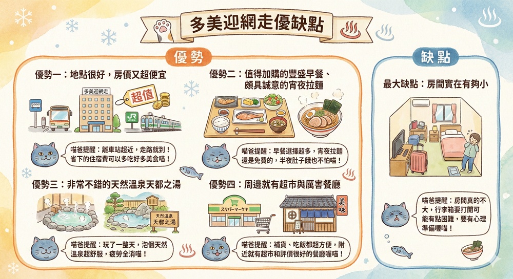 地點好、飯店新、價格便宜、周邊生活機能充足、免費停車、有不錯的大浴場….,毫無疑問多美迎網走(Dormy Inn)會是最推薦的網走住宿首選,但如果你真的很在意小到不行的房間怎麼辦?