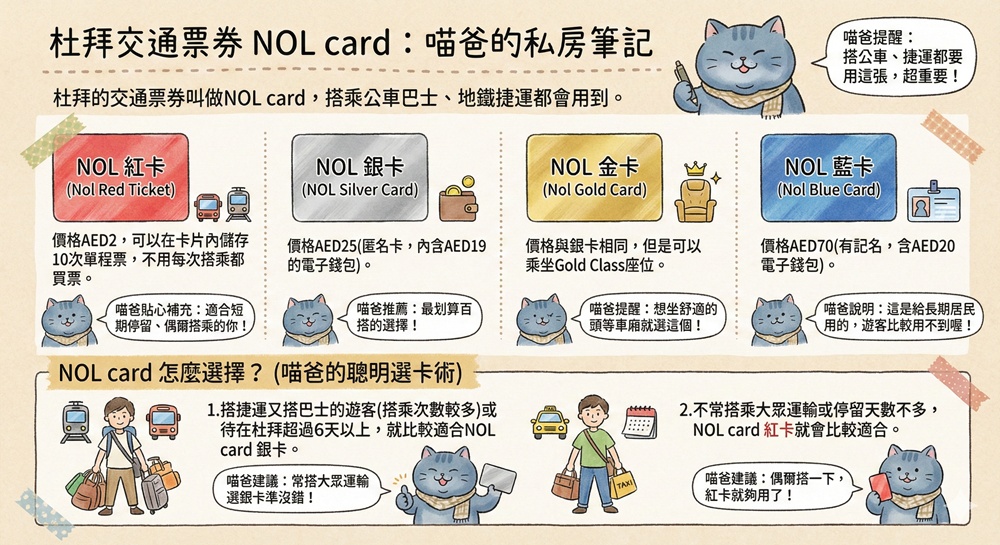 慢慢邁向無現金化的杜拜,巴士、捷運都已經不收現金,短期旅遊(6天以下)喵爸建議選NOL card 紅卡,停留更久或搭乘次數多會建議選擇NOL card銀卡。