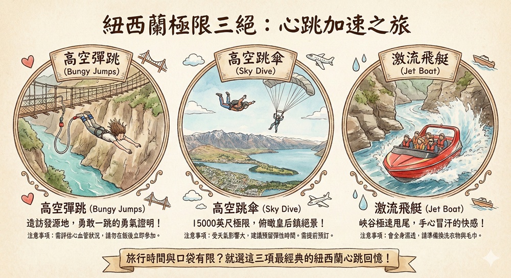 旅行時間有限、口袋深度也有限的情況下,高空彈跳(Bungy Jumps)、高空跳傘(Sky Dive)、激流噴射飛艇(Jet)就是紐西蘭最經典也最刺激的首選!