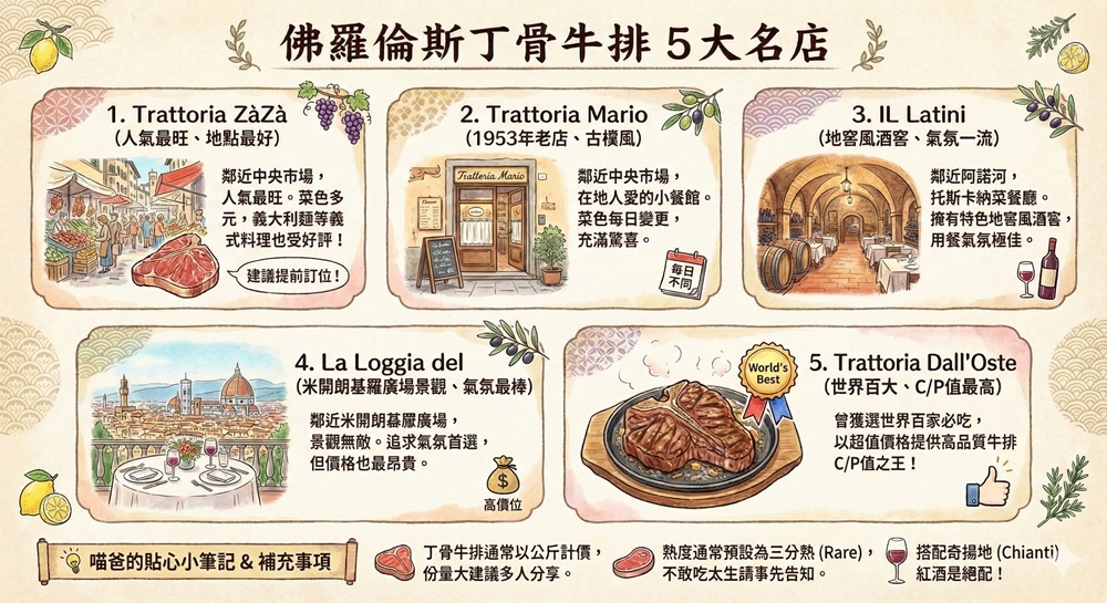 丁骨牛排在佛羅倫斯非常容易看到,只要是供應托斯卡尼菜的餐廳就會有這道菜色,以下就讓喵爸列出佛羅倫斯人氣最高的5家丁骨牛排店。