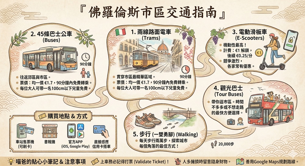 兩條路面電車貫穿市區最精華區域、45條巴士路線往返郊區與市區、機動性最高的電動滑板車、帶你逛市區的觀光巴士與每天步行兩萬步的一雙勇腳,這5樣就是佛羅倫斯交通的全部。