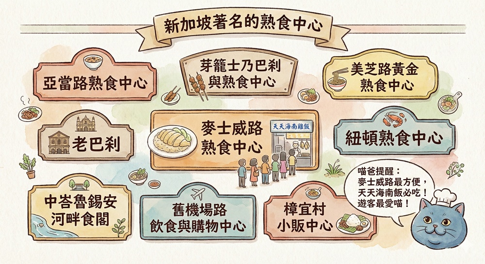 幾乎一個組屋(公營房屋)附近就能找到一個熟食中心,距離市區越遠消費就可能會越便宜,讓喵爸列出一些比較知名、攤位比較多的熟食中心:亞當路熟食中心、芽籠士乃巴剎與熟食中心、美芝路黃金熟食中心、老巴剎、麥士威路熟食中心、紐頓熟食中心、中峇魯錫安河畔食閣、舊機場路飲食與購物中心、樟宜村小販中心