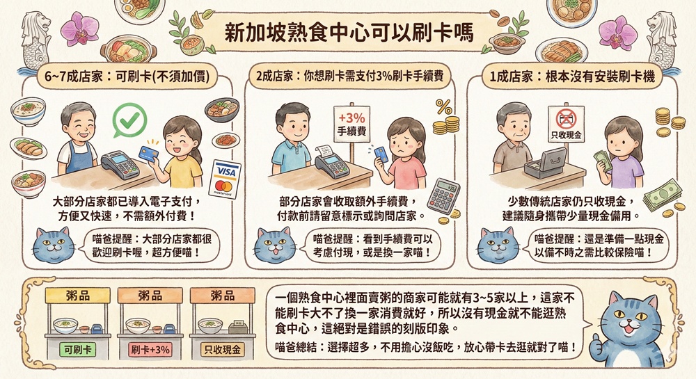 過往都會說新加坡熟食中心只能付現,但近幾年也開始慢慢轉變,喵爸這次前往麥士威路熟食中心、老巴剎大概就有6~7成以上可以刷卡(其中不乏知名的店家),無法刷卡應該慢慢會成為過去。