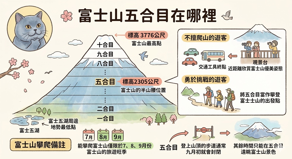 富士山海拔高度為3776公尺,依照高度劃分為一合目~十合目,地勢最低點稱為一合目,富士山頂最高點則稱為十合目。五合目恰巧位在半山腰,也是各種車輛能抵達的最高點。